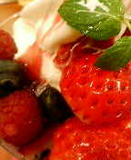 ミルキー味のソフトクリームの上にストロベリーにラズベリー、ブルーベリーとベリーづくし。